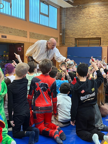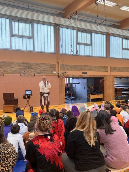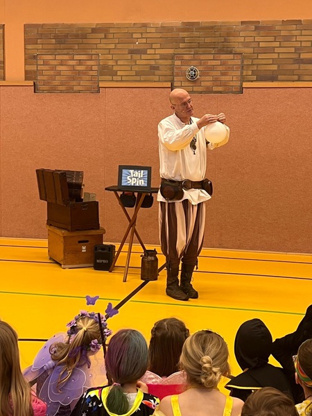 Ein besonderes Highlight war der Besuch von Gaukler Gaudius: Mit seiner Show und vielen verblüffenden Tricks brachte er die Kinder zum Staunen. Dabei machte er nicht nur vor den kleinen Jecken halt – auch die Lehrkräfte wurden kurzerhand Teil der Zauberei. Zur großen Freude aller!